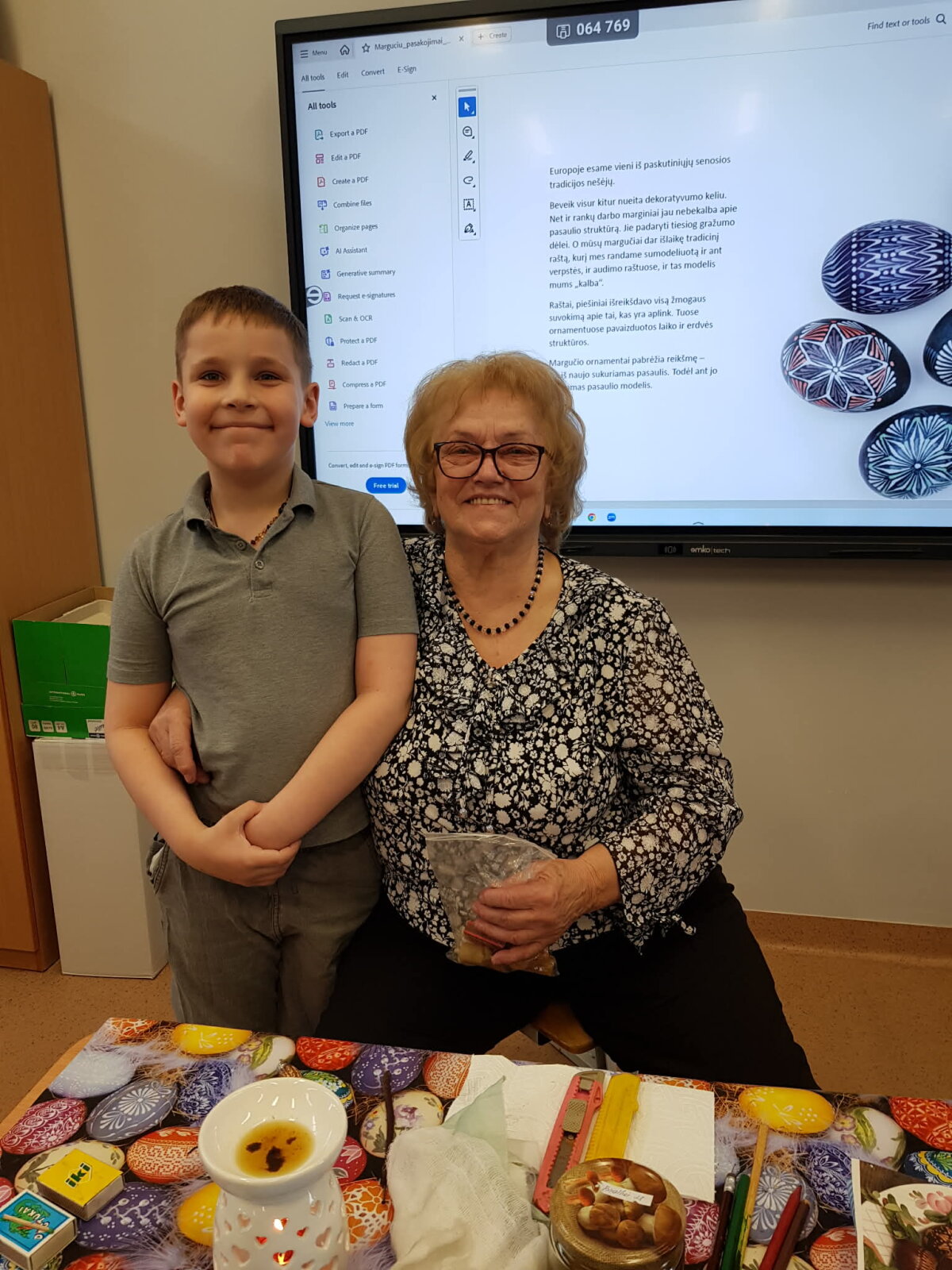Močiutė Monika už gerus darbus vaikus apdovanojo velykiniais margučiais ir pavaišino savo keptais vafliais. Edukacija patiko ir mokiniams, ir joje dalyvavusiems suaugusiems. Vaikai susitarė su močiute susitikti kitais metais prieš Velykas.