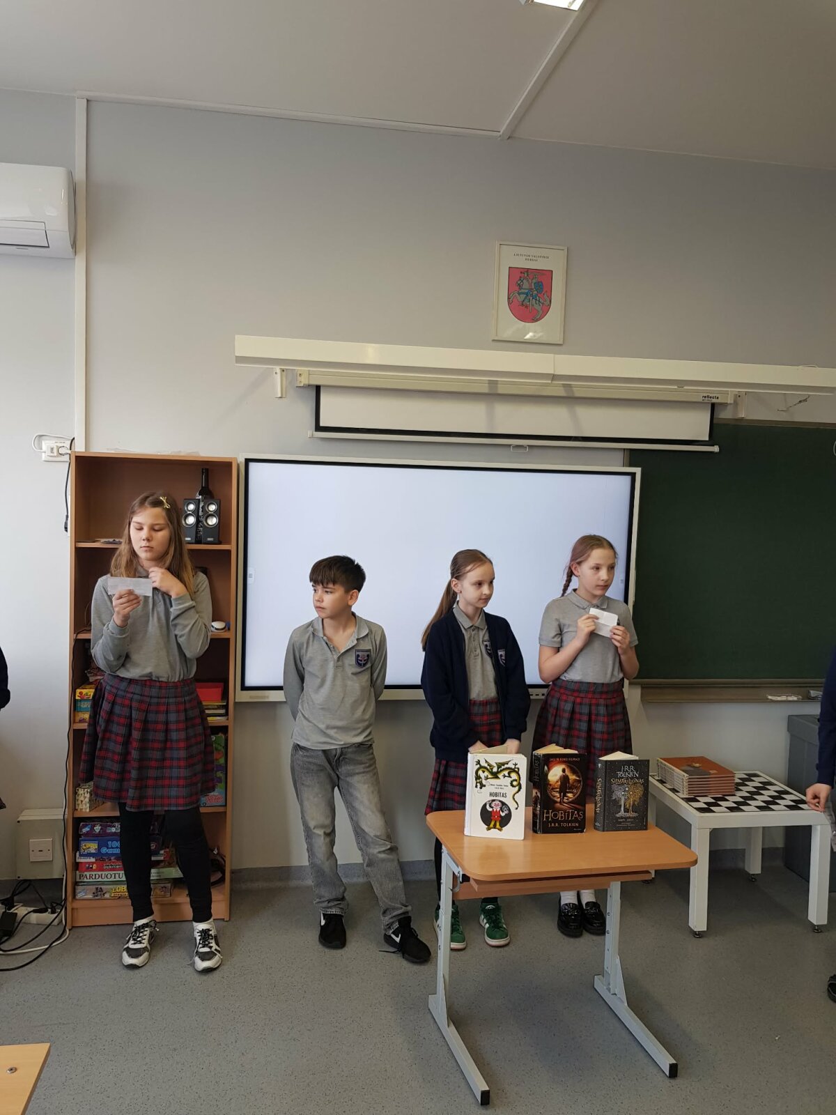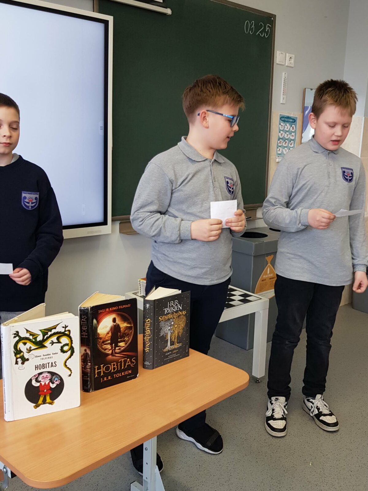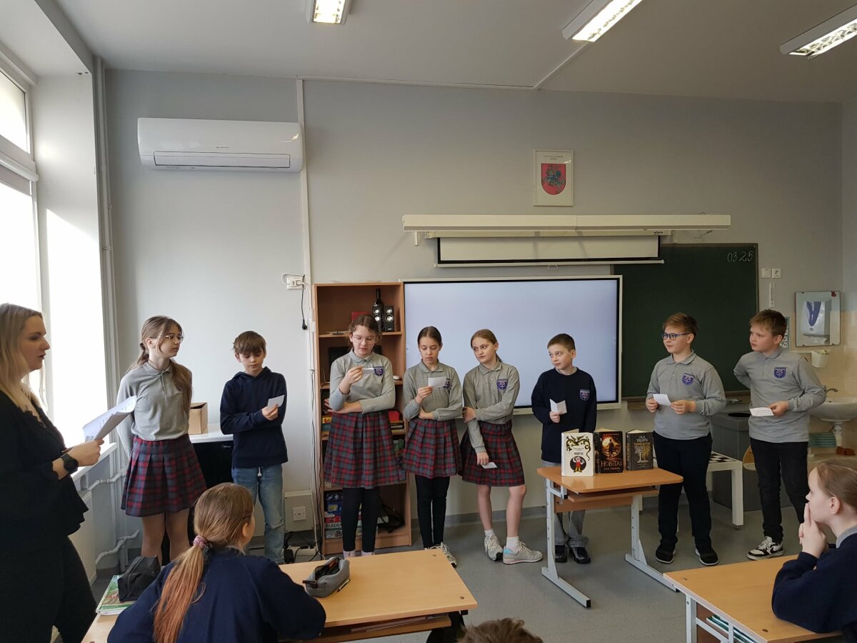 Kovo 25d. minima garsaus rašytojo J.R.R. Tolkieno knygų skaitymo diena. Ta proga tradiciškai mokyklos ketvirtokai, 4B klasės mokiniai, dalyvavo integruotoje anglų kalbos pamokoje mįslių viktorinoje. Mįslės buvo atrinktos iš rašytojo vieno populiariausių kūrinių "Hobitas". Mokiniai spėliojo mįsles anglų ir lietuvių kalbomis bei dalinosi žiniomis ir įspūdžiais iš skaitytų šio rašytojo knygų. Po to pažiūrėjo filmo "Hobitas" ištrauką kaip hobitas Bilbas spėliojo mįsles su senuoju Golumu, gyvenančiu po žeme.